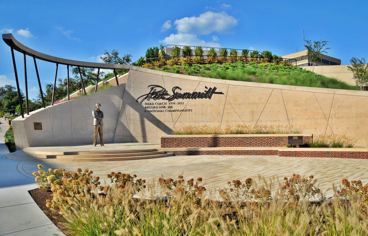 The anchor of the Lake Loudoun Boulevard Streetscape project at the University of Tennessee is the Pat Summitt Plaza, which features a nearly nine-foot-tall bronze statue honoring the legendary basketball coach.